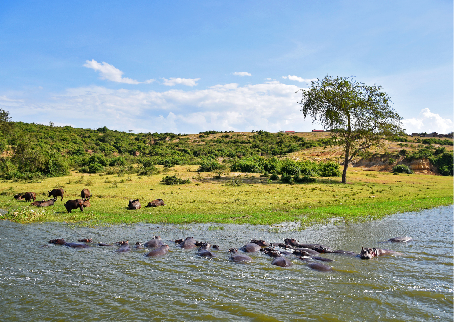 In de middag stappen jullie aan boord voor de iconische boottocht over het Kazinga-kanaal. Dit is een van de mooiste bootsafari’s van Oeganda: nijlpaarden liggen met tientallen tegelijk in het water, krokodillen zonnen op de oevers en olifanten komen drinken langs de rand van het kanaal. Vogelliefhebbers zien hier een indrukwekkende variatie aan soorten. De combinatie van rust, natuur en wildlife maakt dit een onvergetelijke ervaring.