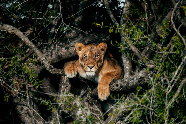 In de ochtend ontdek je de zuidwestelijke Ishasha-sector van Queen Elizabeth National Park, een gebied dat wereldwijd bekendstaat om zijn boomklimmende leeuwen. In grote vijgenbomen liggen de leeuwen vaak te rusten, een gedrag dat je verder alleen in Lake Manyara in Tanzania ziet.