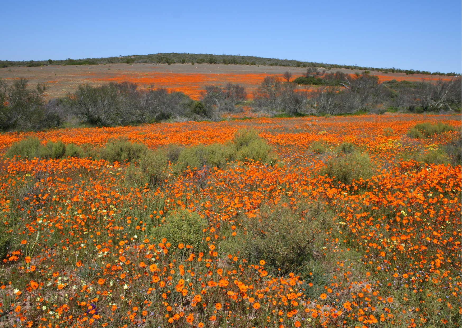In juli en augustus verandert een deel van de West-Kaap in een kleurrijk natuurfenomeen. Vooral Namaqualand en de Cederberg staan dan vol met miljoenen wilde bloemen.